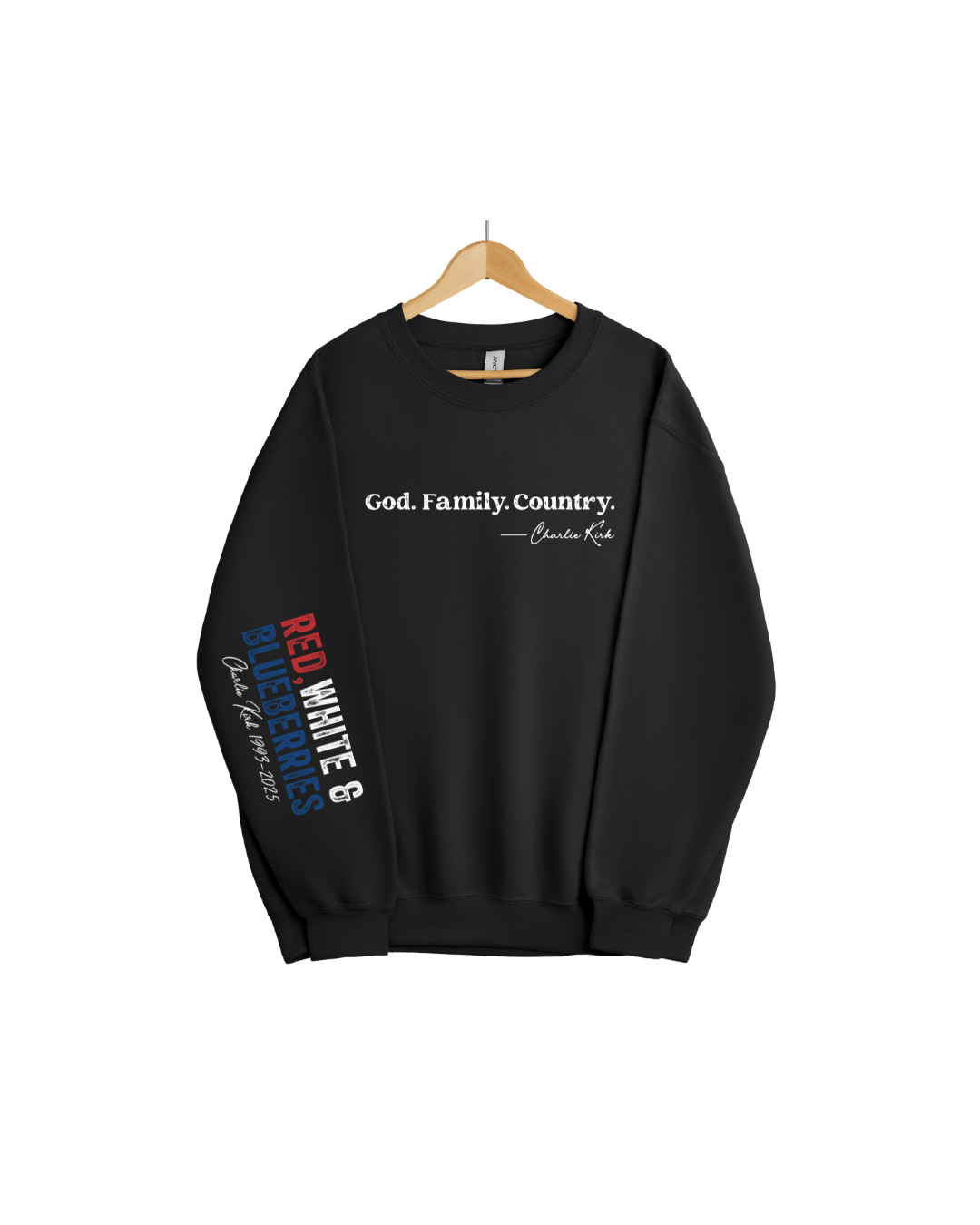 Carry a legacy of love, faith, and sacrifice with this deeply meaningful God. Family. Country. - Charlie Kirk Crewneck. This piece honors Charlie Kirk and the beautiful, enduring values he championed, immortalized in his own words: “God. Family. Country.” It’s more than a sweater; it’s a soft embrace and a bold declaration of what truly matters.