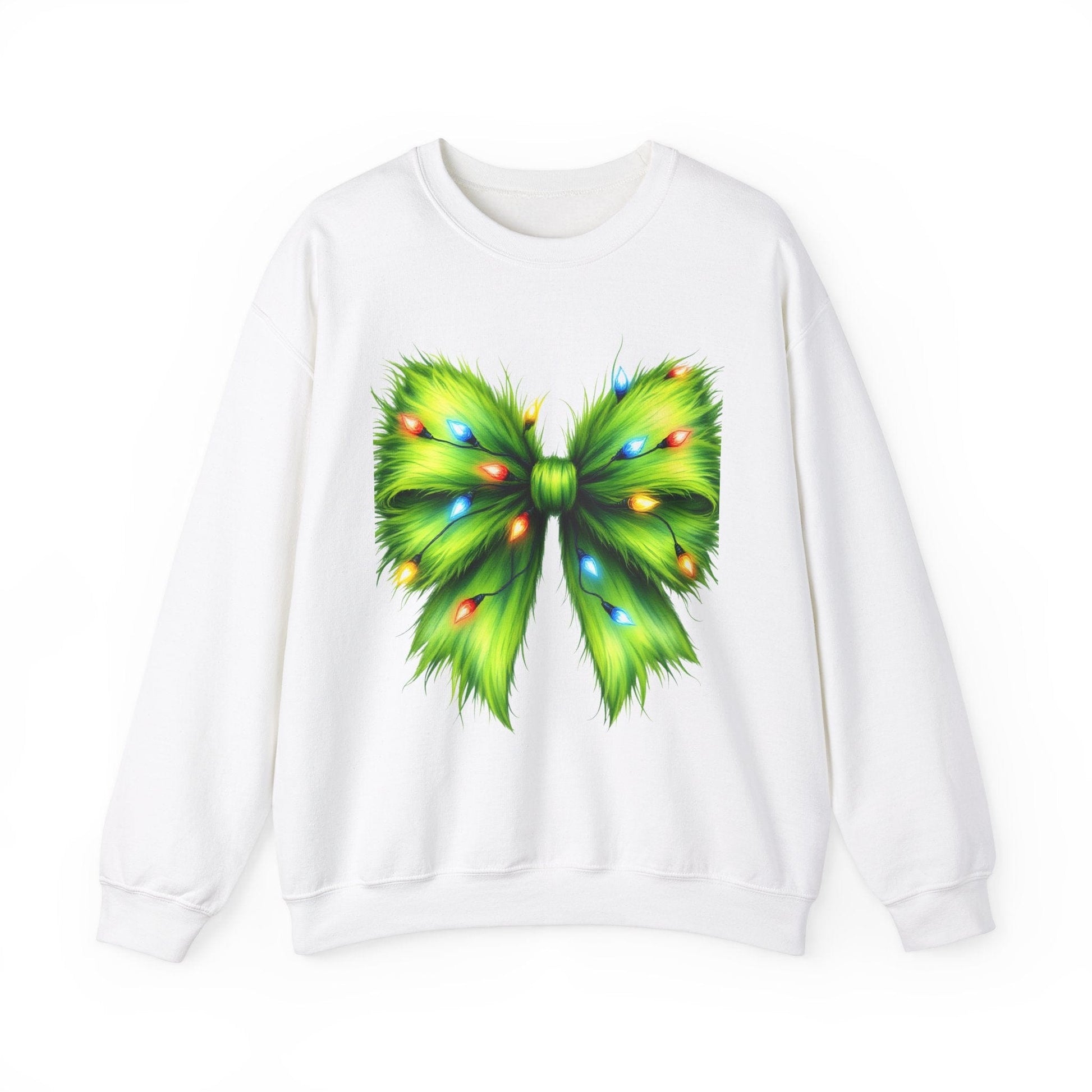Grinch-inspired, coquette style sweatshirt adorned with Christmas lights. Perfect for those who love a festive and playful vibe during the holiday season. Ideal for holiday parties, Christmas celebrations, and cozy nights by the fire.