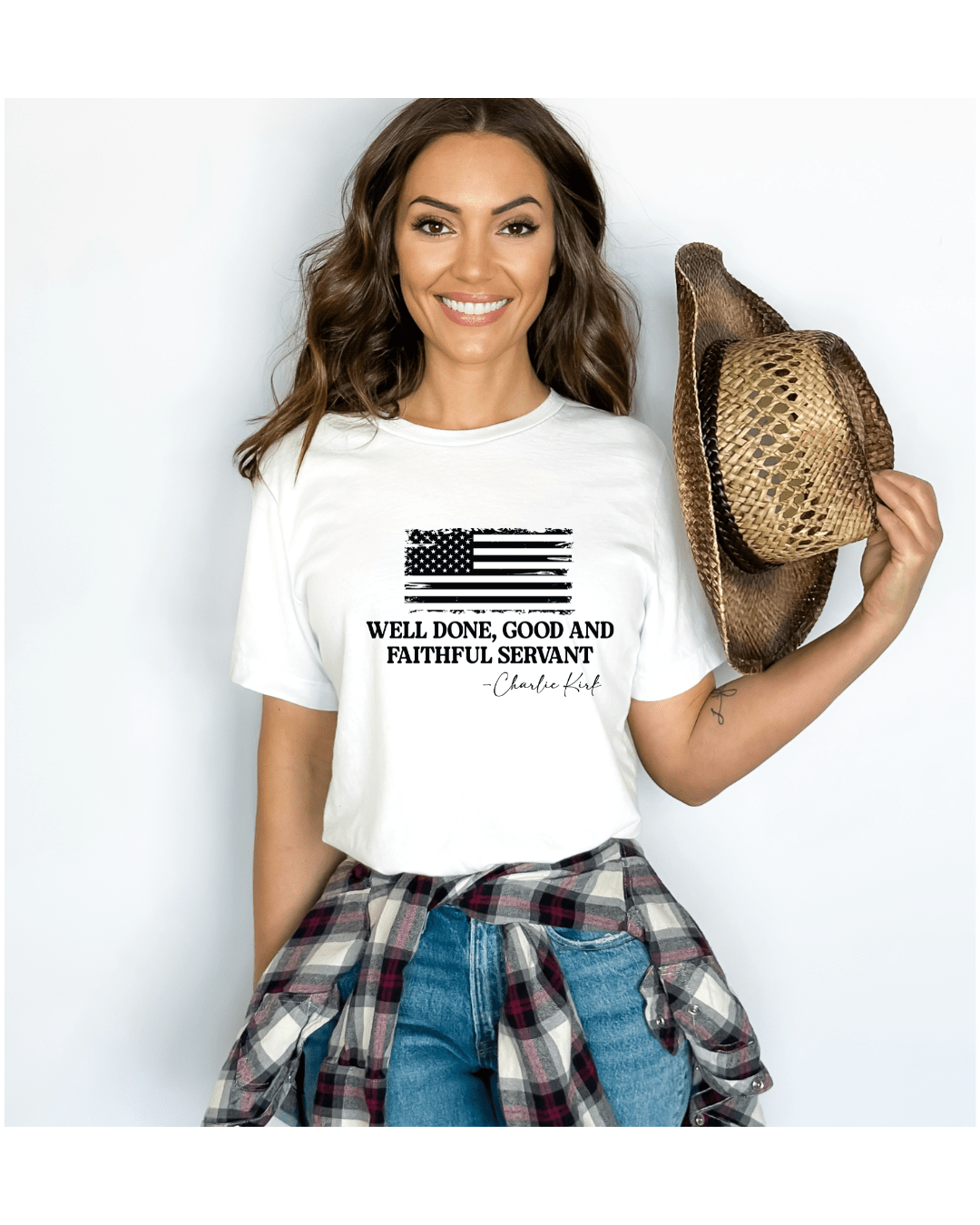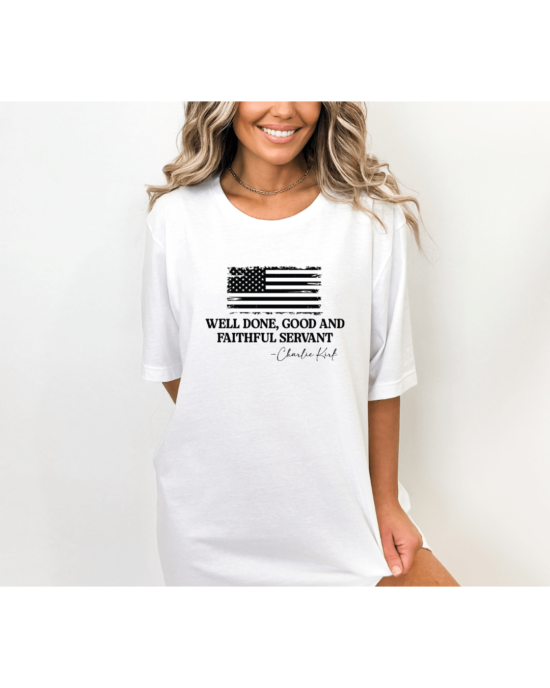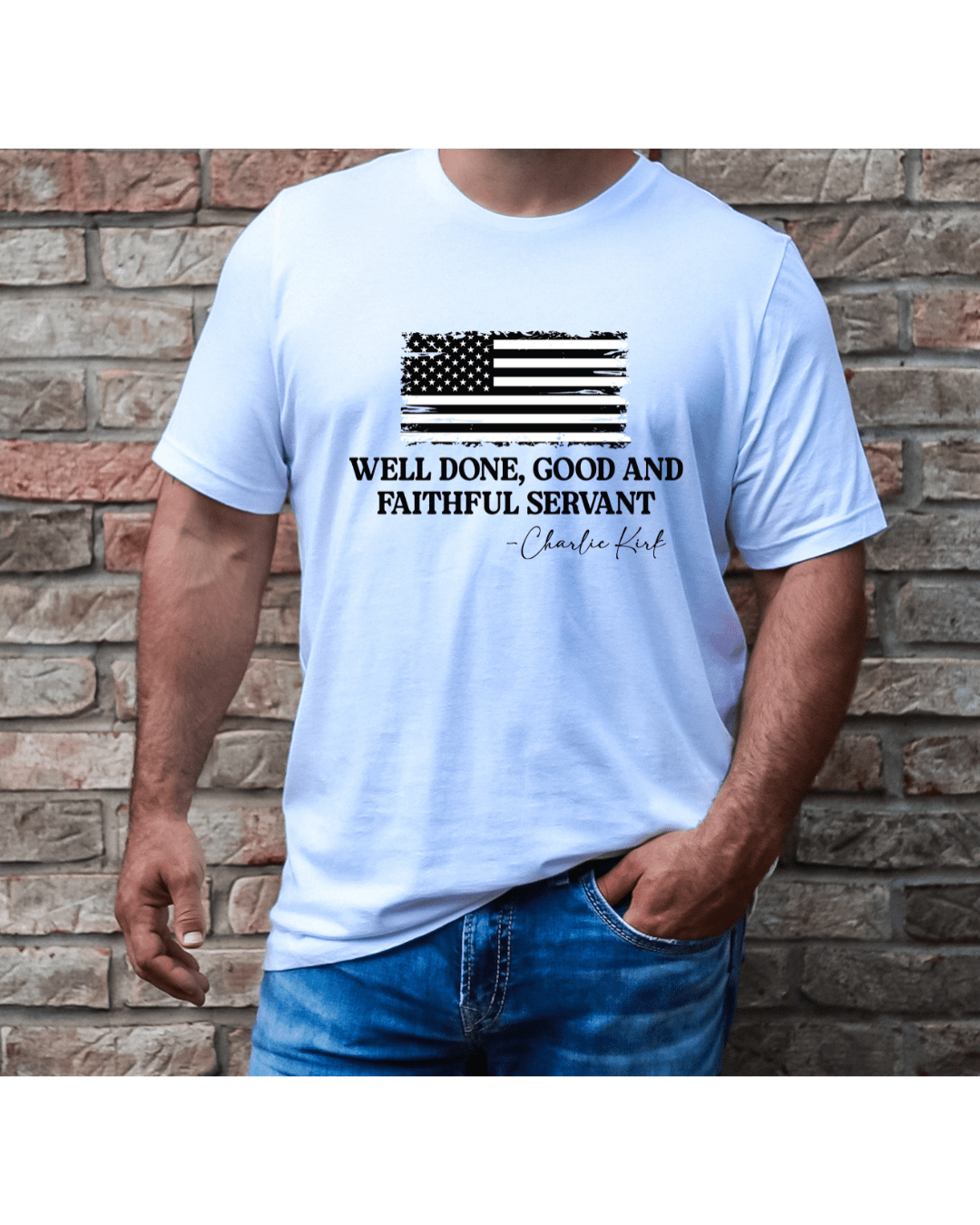 Honor the legacy of a fearless voice for faith and freedom. Our “Well Done, Faithful Servant” Charlie Kirk Remembrance Tee is a poignant tribute to Charlie Kirk, a man who fought tirelessly for Christian values and American principles. More than just apparel, this is a wearable testimony—a statement of solidarity and a reminder to continue the work he started.