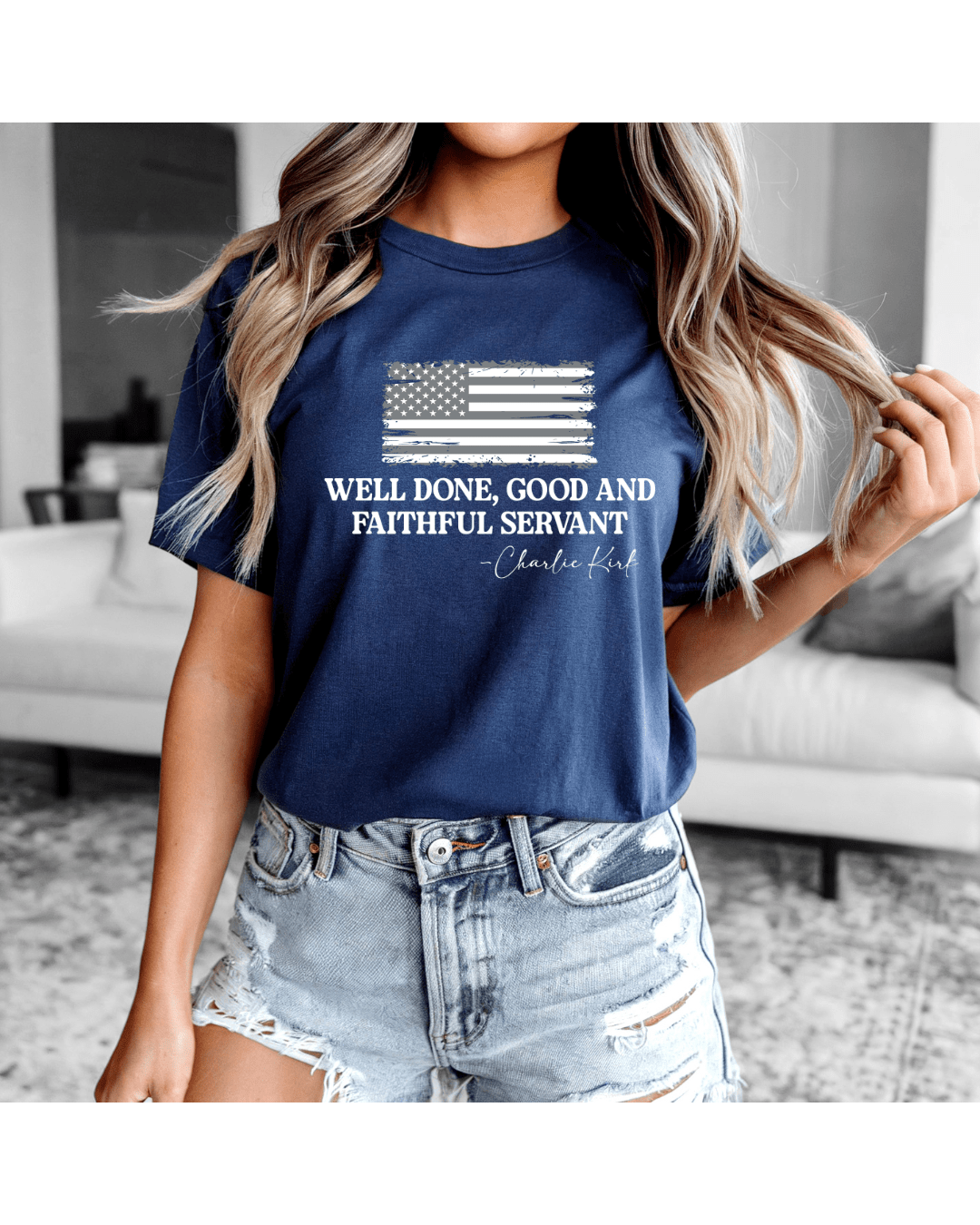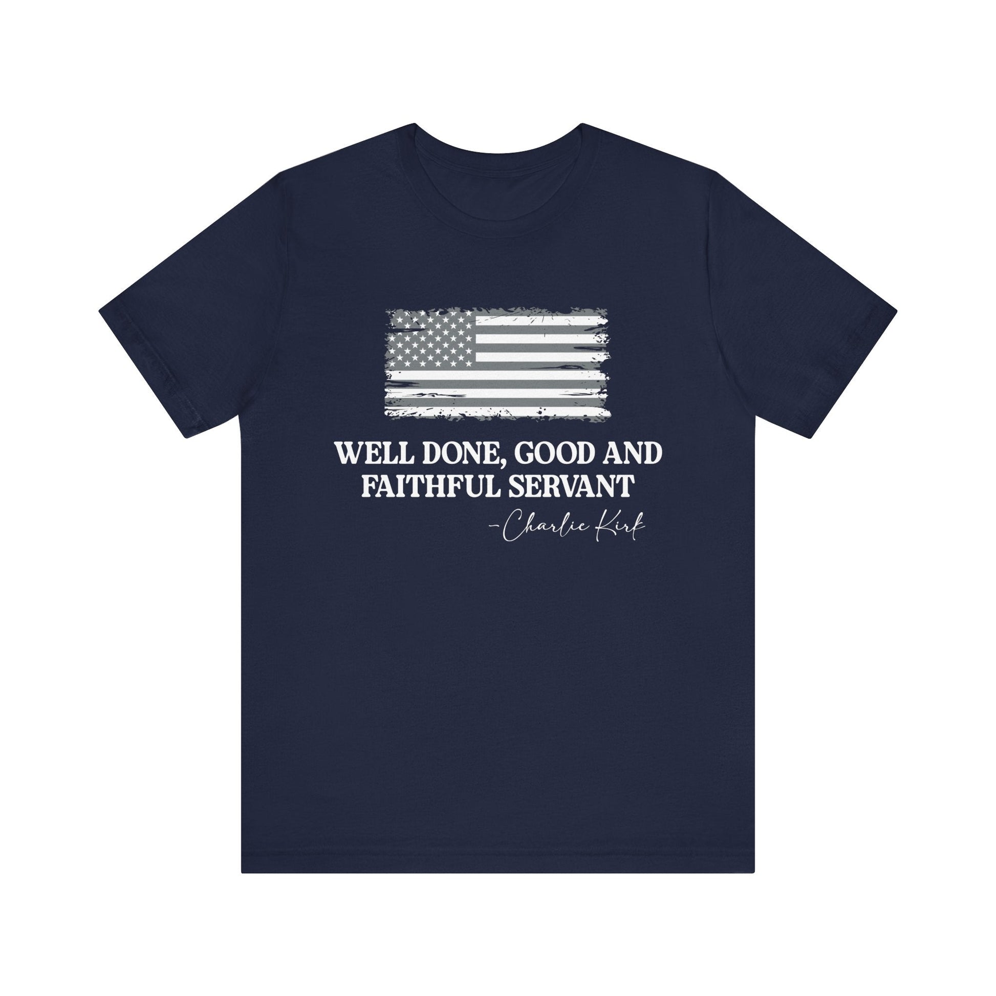Honor the legacy of a fearless voice for faith and freedom. The “Well Done, Faithful Servant” Charlie Kirk Remembrance Tee is a poignant tribute to Charlie Kirk, a man who fought tirelessly for Christian values and American principles. More than just apparel, this is a wearable testimony—a statement of solidarity and a reminder to continue the work he started.
