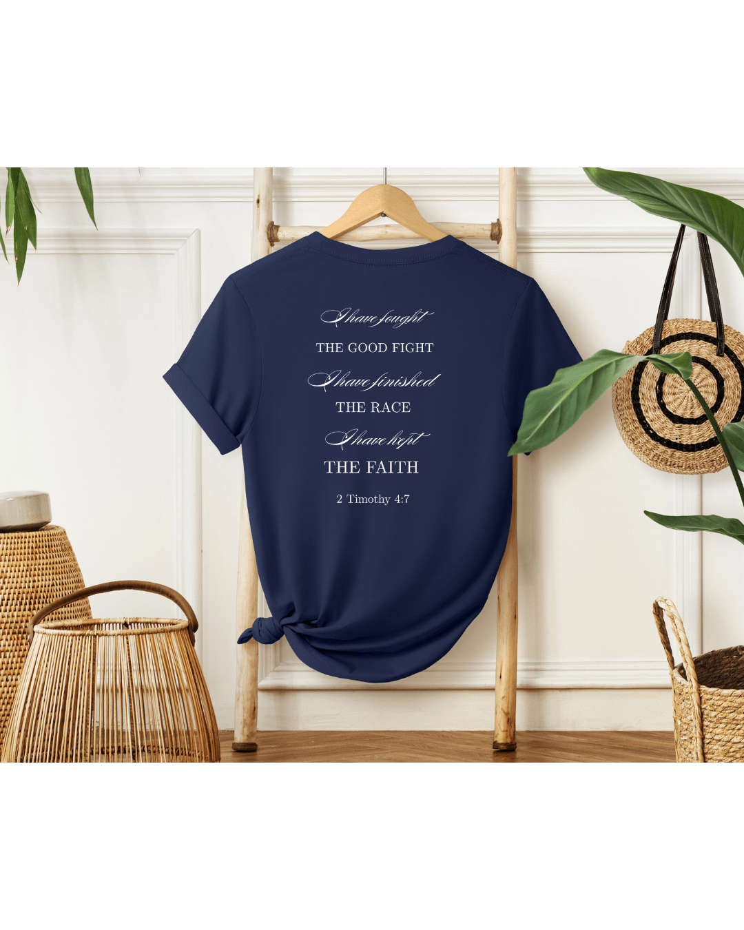 - Powerful Dual-Sided Design: The bold American flag and “Well Done, Faithful Servant” message on the front make a silent, strong statement. The full 2 Timothy 4:7 on the back—“I have fought the good fight, I have finished the race, I have kept the faith”—provides the spiritual foundation and completes the tribute.